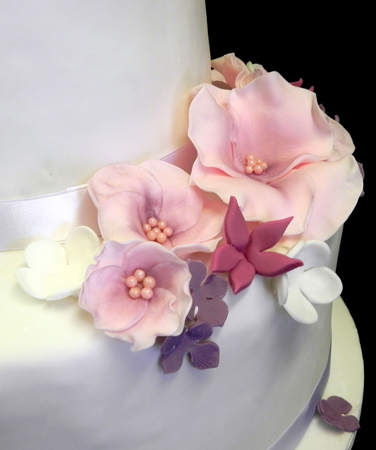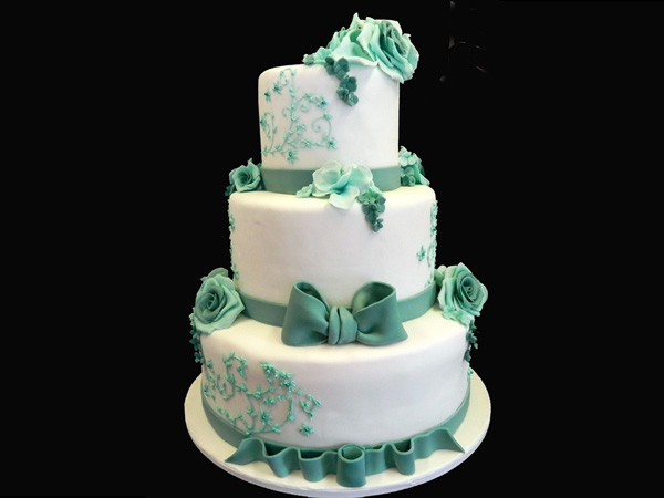 Le torte in pasta di zucchero hanno decorazioni con fiori stampati o rose realizzate a mano in pasta di zucchero.